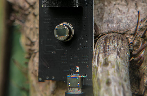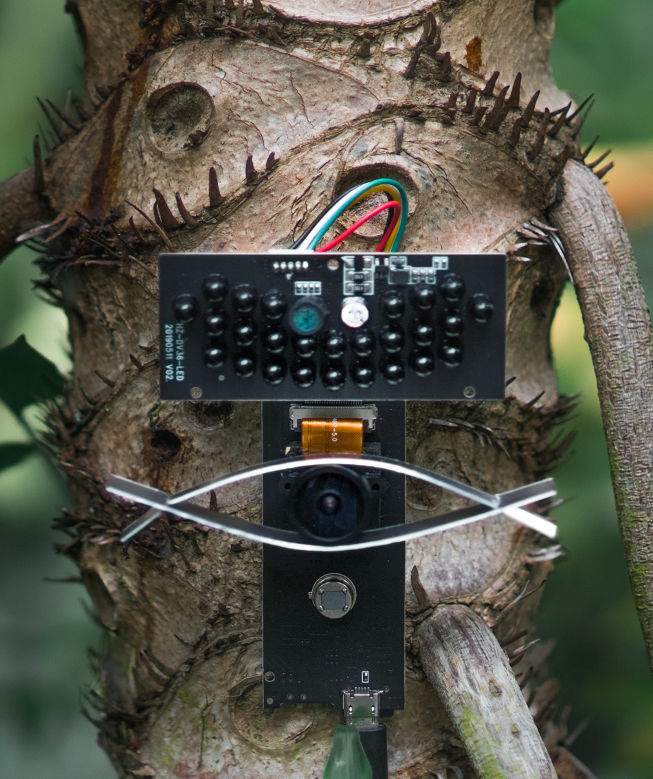 A digital camera activated by a motion detector and powered by a power bank with a solar panel was attached without protection to the trunk of a Cipó-imbé plant (Philodendron imbe), at the mercy of weather conditions and possible interference from beings that inhabit the forest.