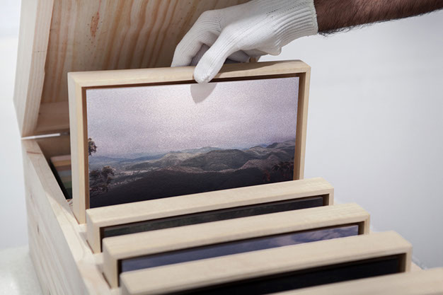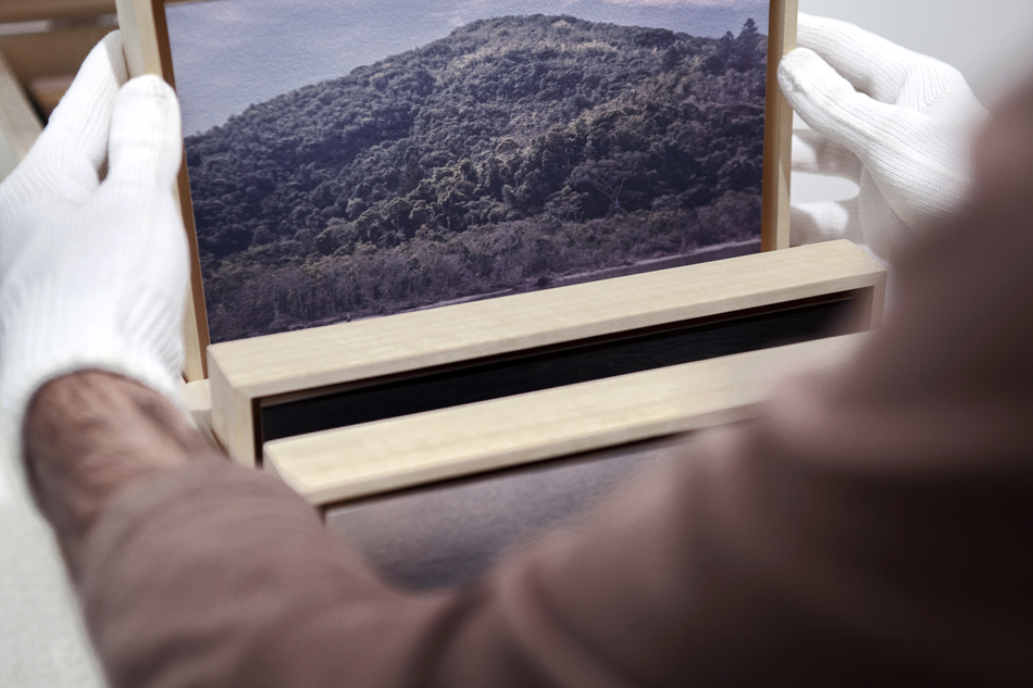 The act of saving images and preserving a memory that you dont want to empty completely, were the start point for this work. The act of archiving does not have logic or rational classification. Photographic images were "selected" by a sort of emotional cartography. On the back of the wooden box, an oil painting indicates the scale of tones used in the five photographs.